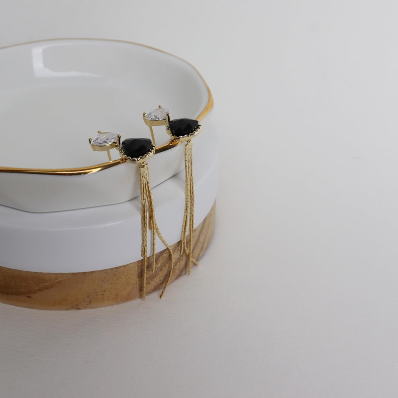 - Sweet double heart long tassel drop dangle earrings, featuring two cute hearts, one sparkly heart shaped cubic zirconia and one black resin gems with dangling fringe tails, adorable and chic.