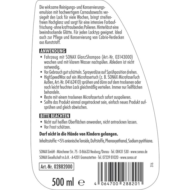 - Box contents: 1x SONAX 02882000 HighSpeed Wax (500 ml)