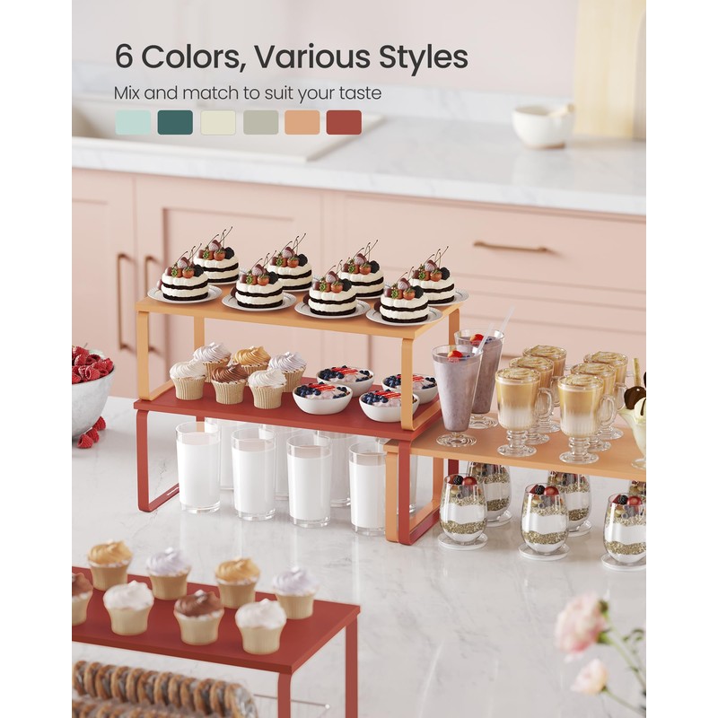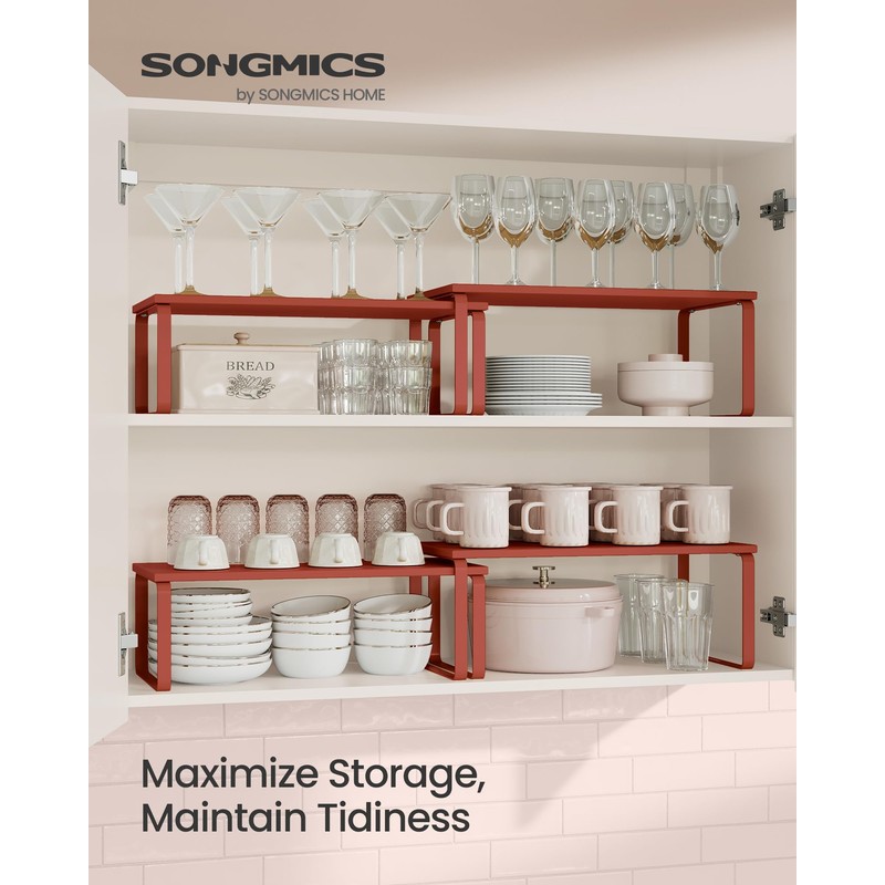 SONGMICS Cabinet Organizer Shelf, Set of 2 Kitchen Counter Shelves, Kitchen Storage, Spice Rack, Stackable, Expandable, Metal and Engineered Wood, Mandarin Red UKCS200Y02
