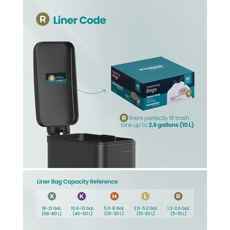 - [Bag Specs] These garbage bags, sized at 16.5"W x 17.3"H with a volume of 2.6 gallons, come in 2 rolls of 40 pieces and are identified by the liner code R