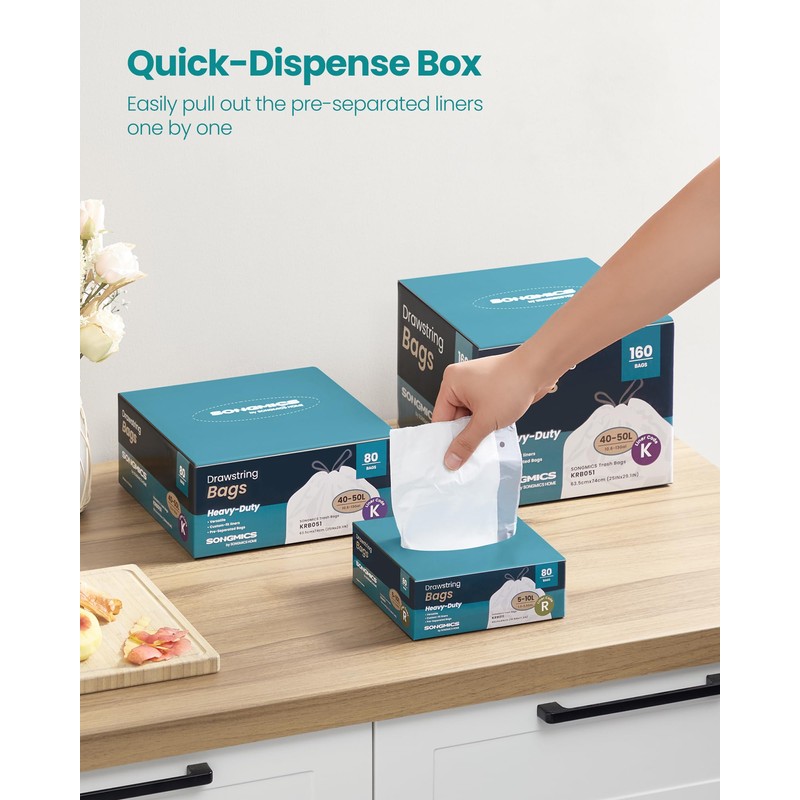 - [Quick-Dispense Box] Designed with a top-dispensing box, these liner bags come pre-separated for quick access. Simply pull them out one by one—no more struggling with frustrating perforations