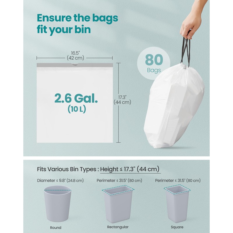 - [Convenient Drawstring] The handy drawstrings on both sides of the bag allows for easy closure and removal of the garbage. The drawstrings grip the bin rim tightly without sliding down and effectively seal the bag, trapping any unpleasant smells