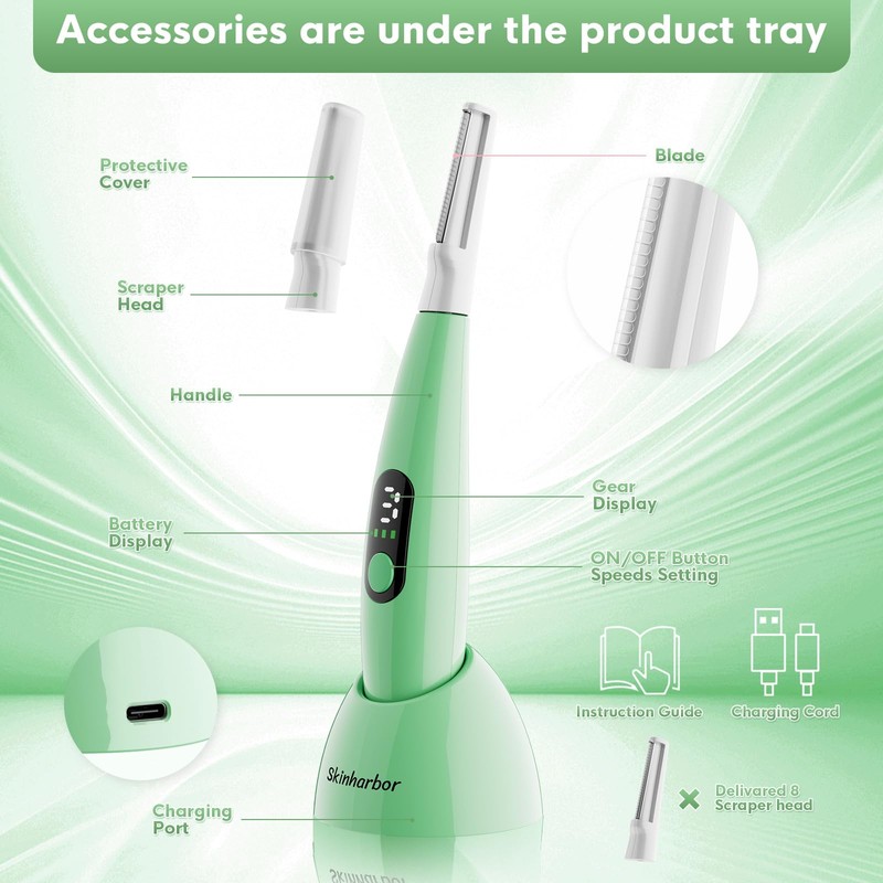 - 【Your Ultimate Beauty Companion】For visibly revitalised skin and flawless makeup. This innovative exfoliating tool not only removes dead skin and unwanted facial hair, it also effectively reduces the appearance of fine lines and wrinkles, revealing a youthful glow like never before.(Accessories are under the product tray)