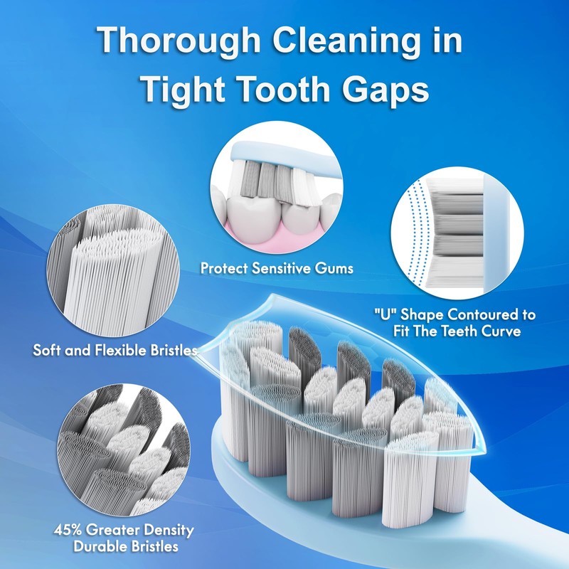 - 【Versatile 5-Mode Design】This electric toothbrush offers users an even more versatile and customizable cleaning experience. The 5 core modes allow users to precisely target their specific oral health requirements, whether it's thorough cleaning, whitening, gum care, or gentle sensitivity-focused brushing. This level of personalization further enhances the product's ability to deliver exceptional cleaning results tailored to individual user needs.