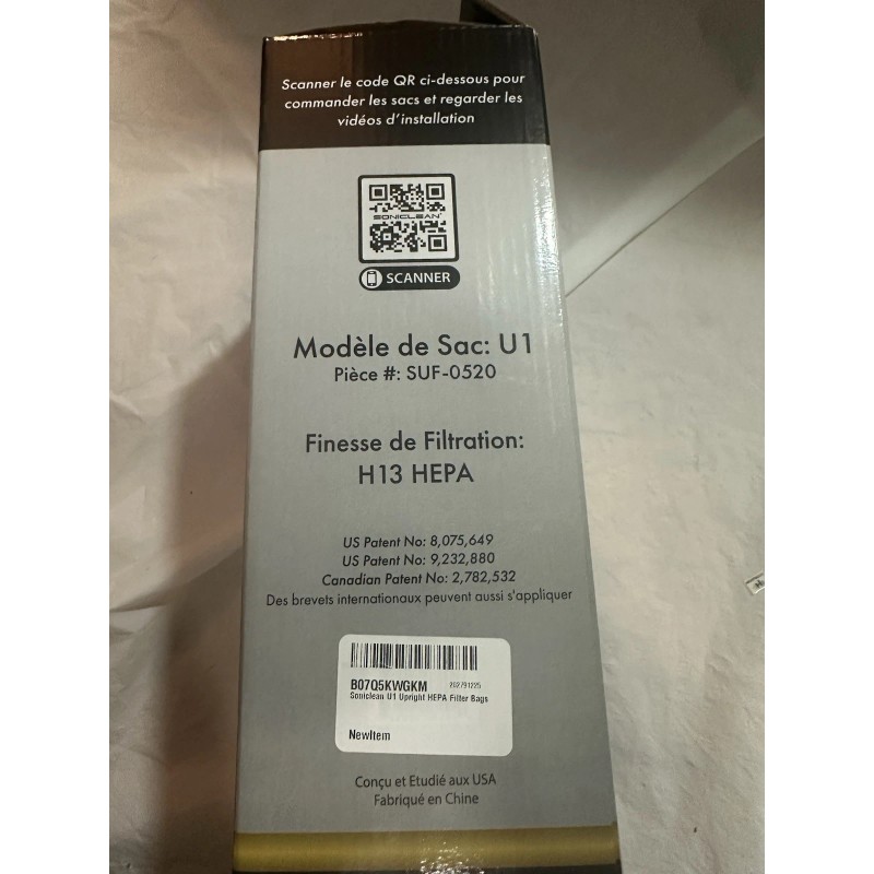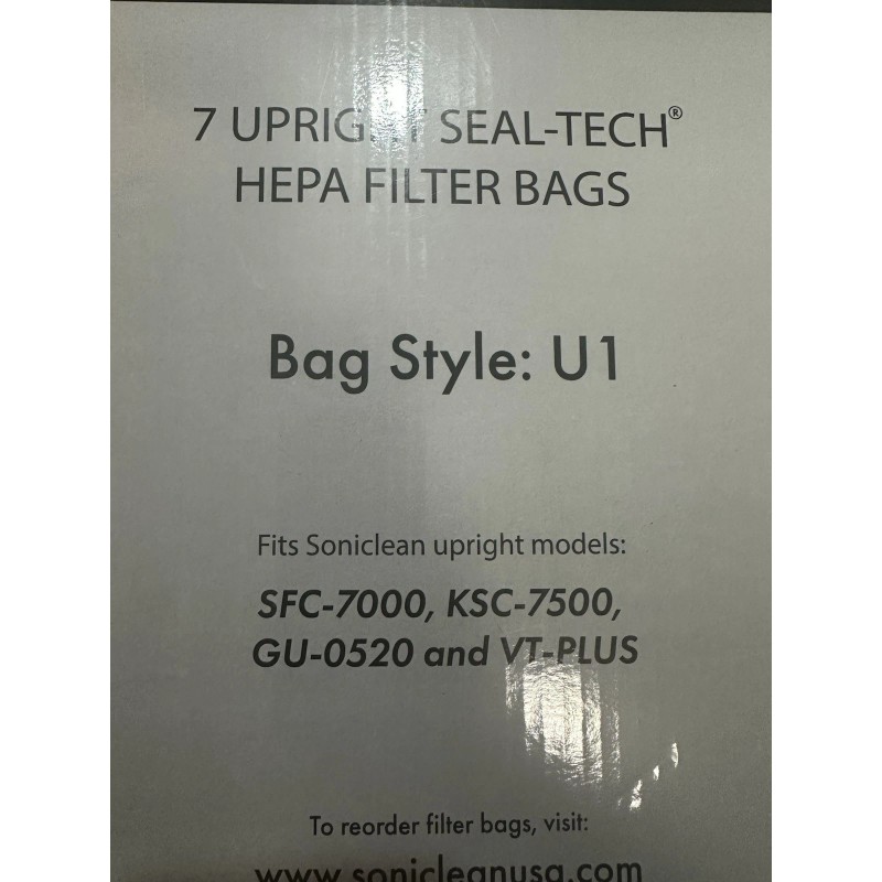 The Box of 7 Soniclean U1. SUF-0520, SFC-7,000 /KSC-750 / VT-Plus. Upright HEPA Filter Bags is a set of disposable vacuum cleaner bags specifically designed for Soniclean vacuum cleaners. These filter bags are compatible with Soniclean models such as Soft Carpet, Galaxy uprights, and VTplus. With features like being hypoallergenic and Energy Star compliant, these HEPA filter bags provide a clean and efficient solution for maintaining a healthy indoor environment. The set includes 7 filter bags, making it convenient for regular use and ensuring that you have an ample supply on hand.