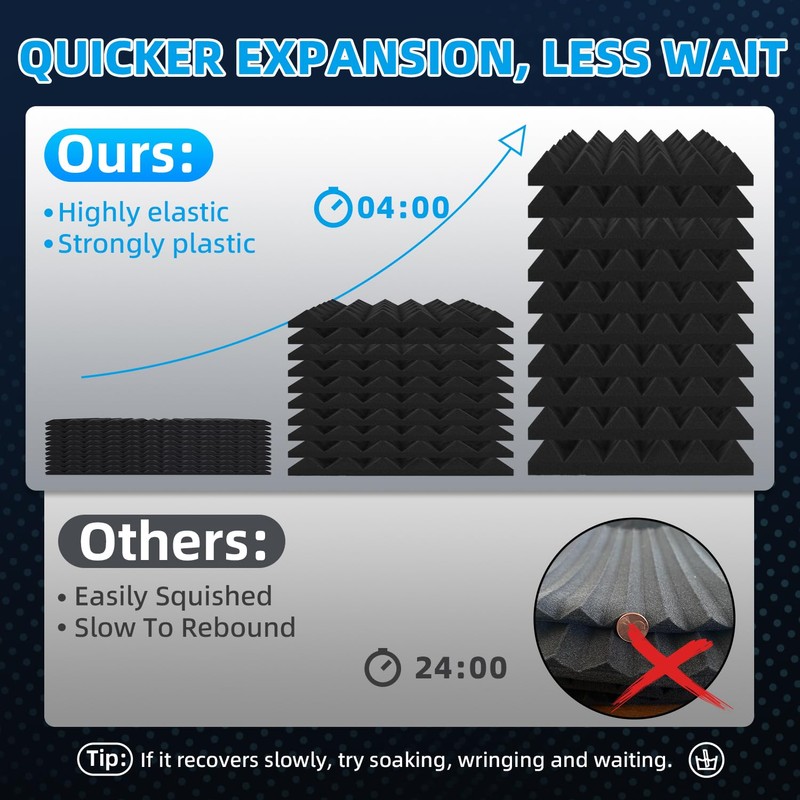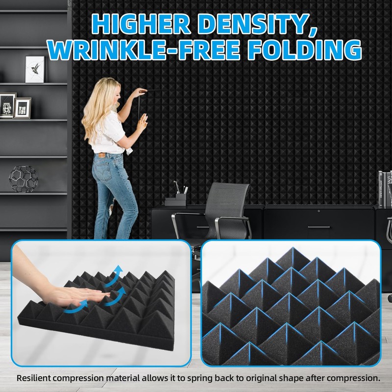 - 【RESILIENCE】Our acoustic foam panels are made of highly resilient material that rapidly returns to its original shape even after being compressed and packed for an extended period. Acoustic panels sound absorbing quickly recover in just 3-5 hours of dispersal and ventilation. PLEASE NOTE: If it does not regain its shape, soak the noise reduction wall panels in water for one minute, then wring out the water and dry at low temperature or air dry/sun dry.