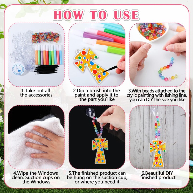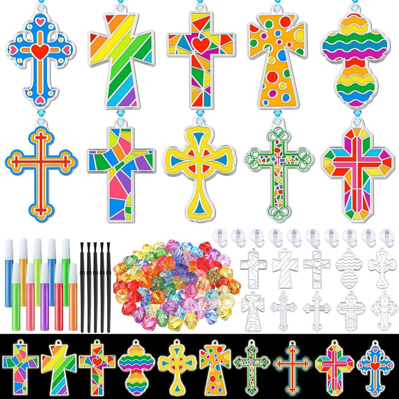 - Cross DIY Craft Kit: 30 sets DIY window art suncatcher kits include 30 pcs cross christian DIY suncatcher making kits in 10 designs, glow in the dark color suncatcher paints (6ml each bottle), 30 paintbrushes, 300pcs acrylic beads, 1 roll of 590.55" fishing line, 30pcs suction cup hooks; This comprehensive kit provides hours of artistic enjoyment, making it a good choice for family christian activities, VBS, Sunday School, or alone art time