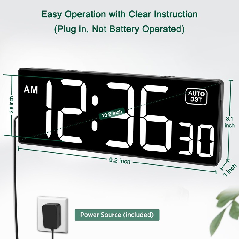 Soobest LED Digital Wall Clock with Seconds, Electric Clock Plug Auto DST Dimmer LED Large Display 10 Inches (White)