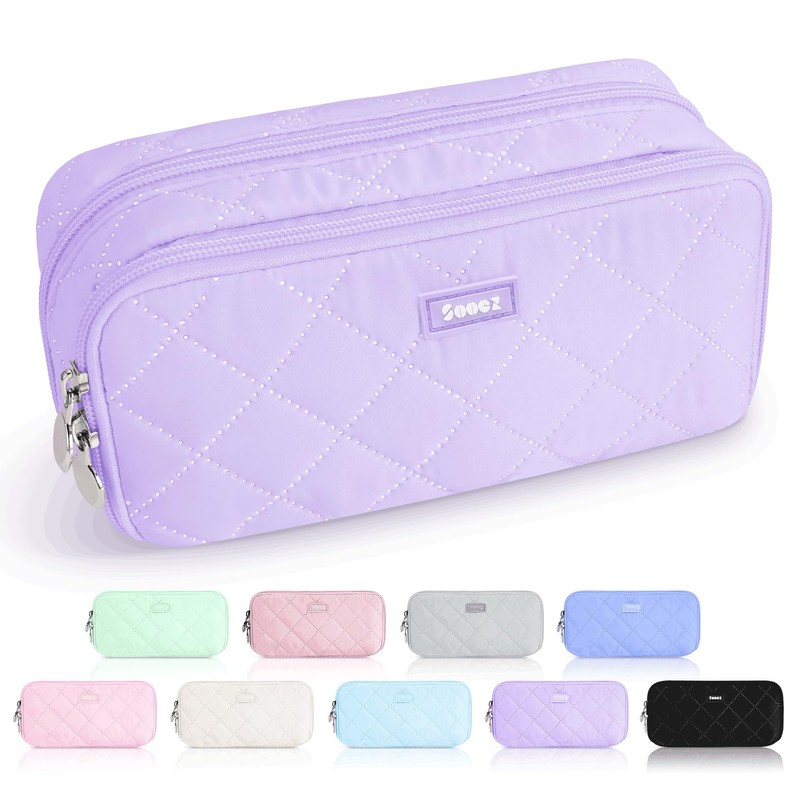 Sooez Large Pencil Case Pouch, Extra Big Pencil Bag with 8 Compartments, Pen Bag Wide Opening, Soft Quilted Pencil Pouch Organizer with Zipper, Portable Pencil Case for Teen Girls, Purple