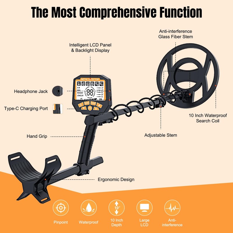 - 【5 PROFESSIONAL DETECTION MODES】The Metal Detector features 5 upgraded modes for precise, master all terrains with All Metal/Jewelry/Relic/Coin/Custom modes to facilitate reduced search time, modes include: ①All Metal: Detects any metal. ②Disc Mode: Ignores unwanted metals. ③Memory Mode: Detects only your chosen metal type. ④Jewelry Mode: Focuses on finding jewelry. ⑤Pinpoint (PP) Mode: Locates targets accurately. An upgraded chip and auto-balance technology allow detection up to 10 inches deep.