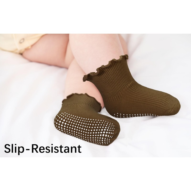 Sooneeya Toddler Ruffle Crew Socks Girls Anti-Slip Grips Sock Comfy and Casual for Kids Indoor 1-2T 6 Pairs White Beige Orange Khaki Deep Khaki Brown