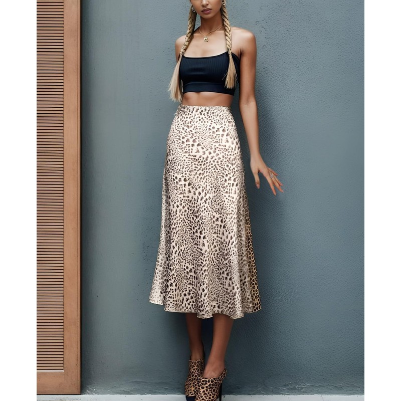 High Waist Leopard Light Green Brown Midi Skirt Hidden Elasticized Waistband Silk Satin Skirts
