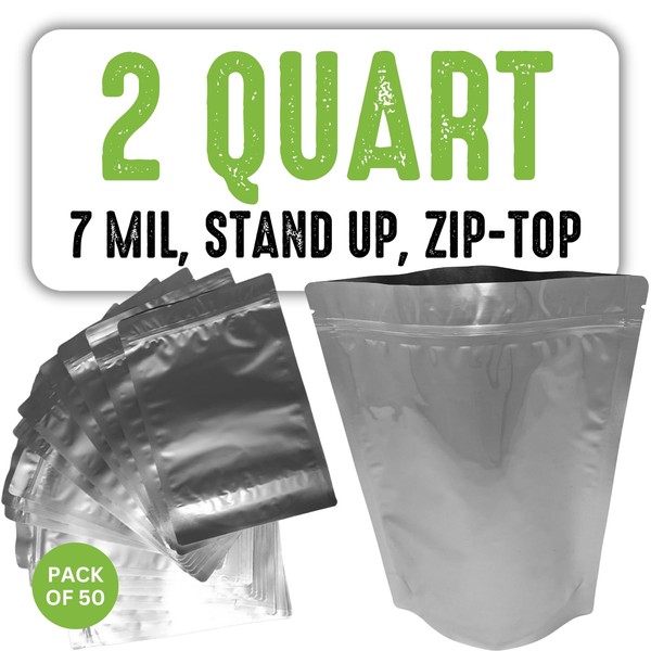 Sophos Survival 50 Mylar Bags for Food Storage, Airtight 7-Mil Thick Gusseted Zip Lock, Long Term, Reusable, Emergency Food Supply & Freeze Dryer Bags - 2 Quart 8x12 Inch