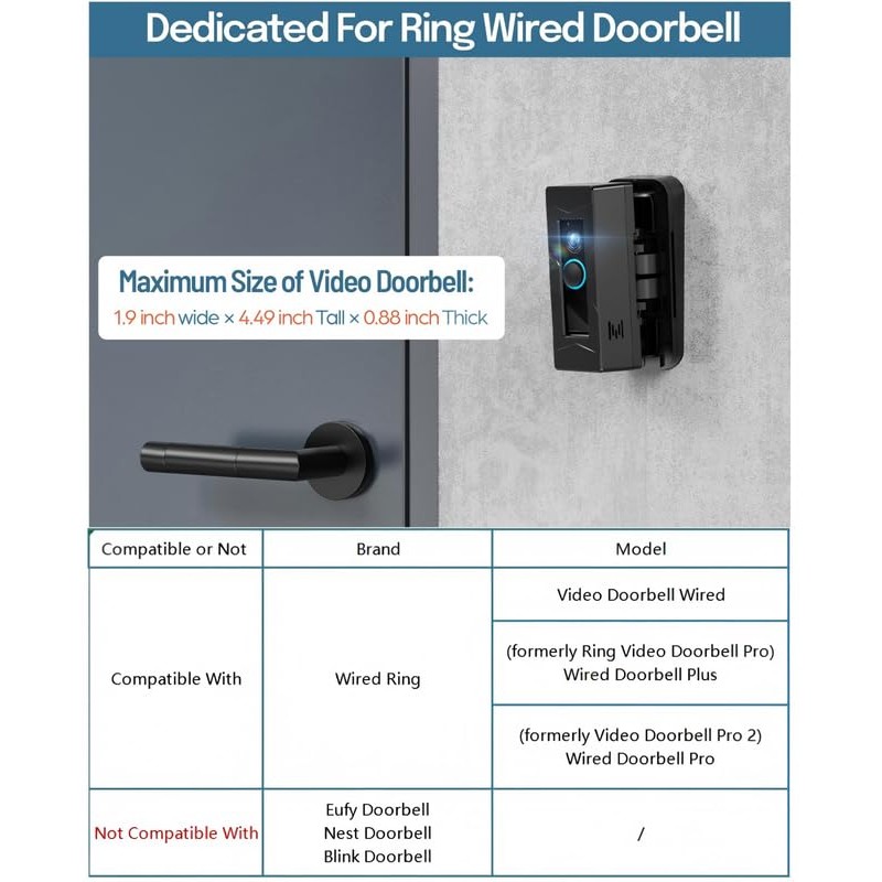 - Tamaños personalizados diseñados para timbres con cable de anillo: el soporte de timbre de ángulo ajustable Trushome es un soporte diseñado específicamente para el timbre con cable de Ring. Tamaño máximo del timbre de video: 1.9 pulgadas de ancho x 4.49 pulgadas de alto x 0.88 pulgadas de grosor. Los timbres aplicables incluyen: timbre de video con cable/(anteriormente Ring Video Doorbell Pro) timbre con cable Plus/(anteriormente Video Doorbell Pro 2) Timbre con cable Pro. Nota: ① Solo para timbres de video con cable, no para inalámbricos; ② El soporte del timbre no es compatible con los soportes Eufy, Blink, Nest.