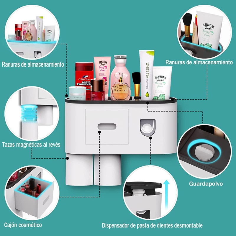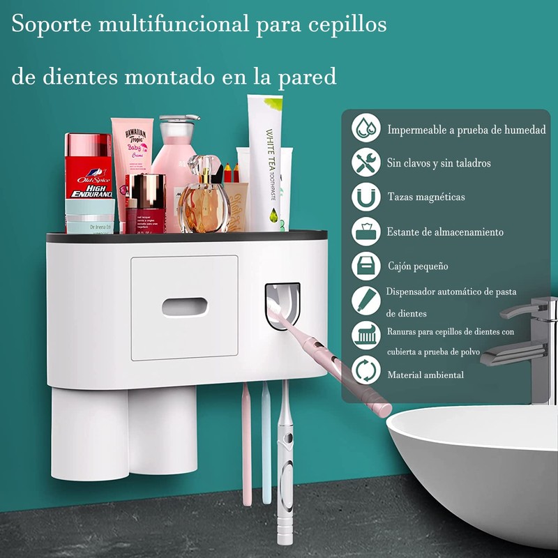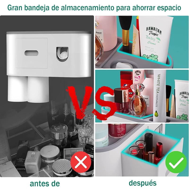 - 【BANDEJA DE ALMACENAMIENTO GRANDE】 No solo un soporte para cepillos de dientes y un dispensador de pasta de dientes, sino también una bandeja de almacenamiento. La bandeja de almacenamiento en la parte superior del soporte para cepillos de dientes tiene varios compartimentos, en los que se puede colocar pasta de dientes, jabón, peine, cosméticos, maquinillas de afeitar, etc., y también tiene cajones y cajas de almacenamiento de cosméticos incorporados.