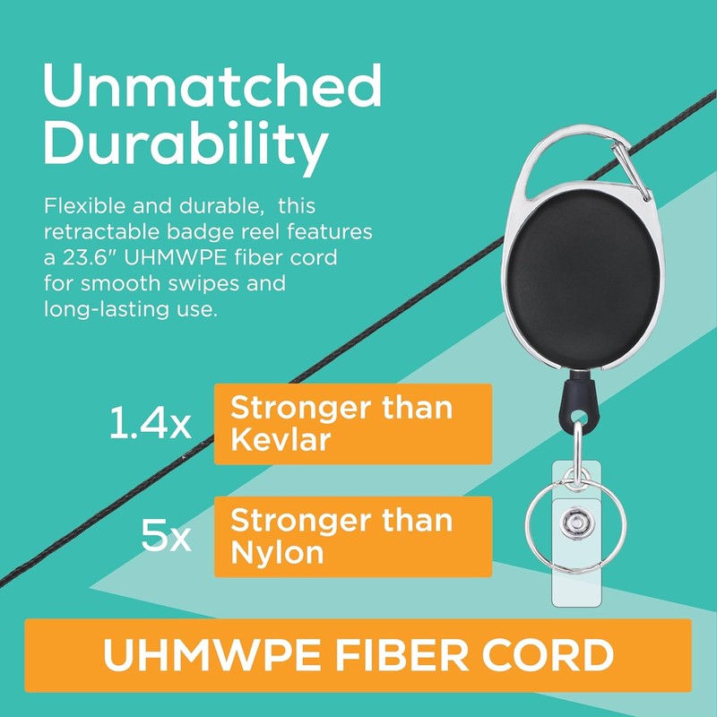 El soporte para tarjetas de identificación Will Well es resistente y viene en un paquete de 2, con clips y carretes retráctiles que soportan hasta 100,000 tirones. Puede cargar hasta 7 llaves y cuenta con un cable de 23.6 pulgadas hecho de fibra UHMWPE, más duradero que el acero. Además, incluye una funda transparente vertical para tarjetas, con capacidad para hasta 3 tarjetas del tamaño de una tarjeta de crédito.