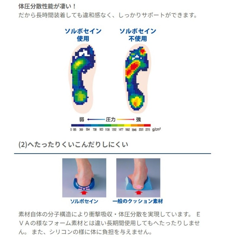 - 中足部を締めて浮き指対策。足を元気に。からだを守る人工筋肉ソルボセインと医療の現場で使用されているテーピング理論を組み合わせ、足のトラブルを軽減します。両足用の3ペア分入っています。