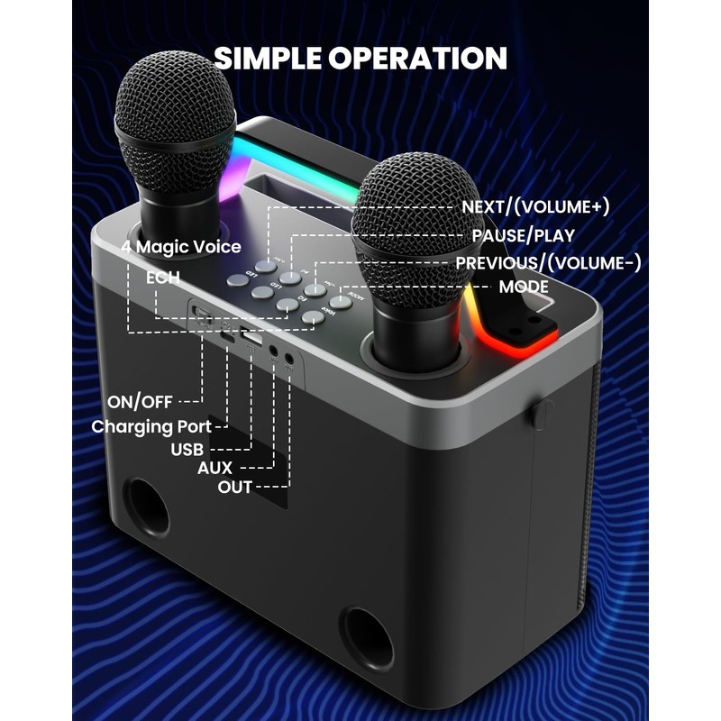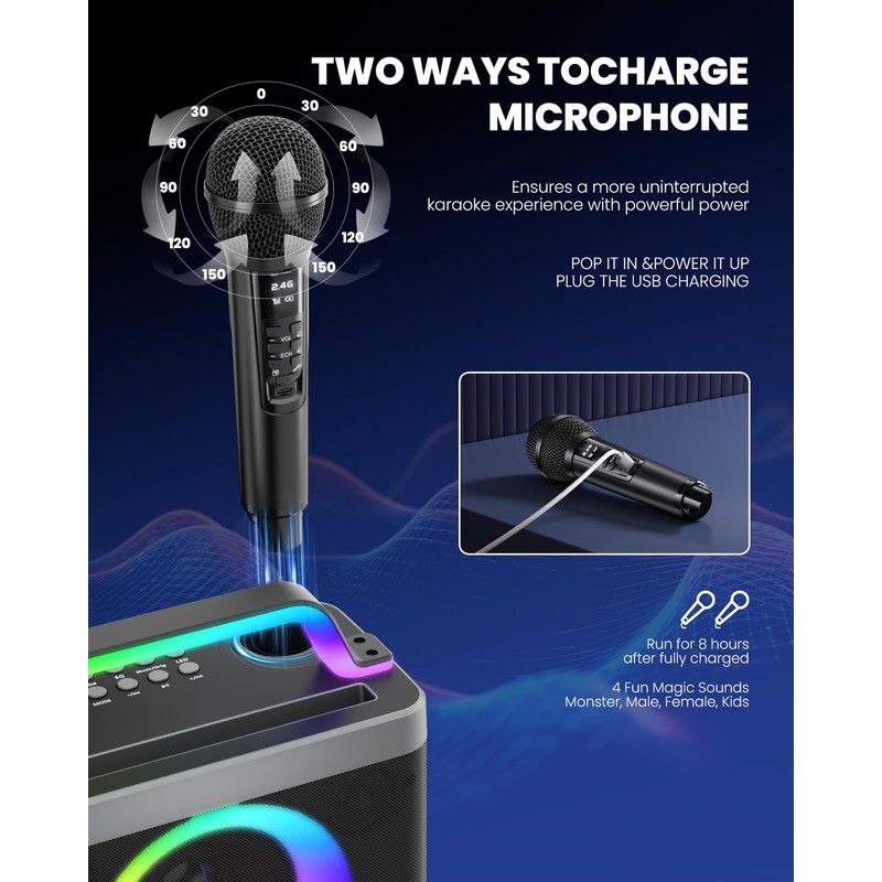 - [Pro Mic Controls] Two microphones with independent volume, vocal cancellation, and reverb adjustments. Easily balance vocals and background music for professional sound. Four fun sound effects spice up performances. Charge mics in the speaker dock or via USB-C cable. Avoid holding the microphone too close to the speaker, as this will make sharp sounds (a common sound reflex)