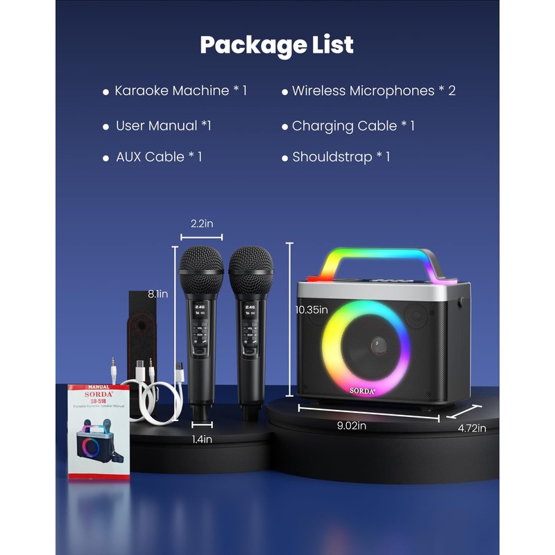 - [Worry-free Warranty] SORDA offers a 12-month warranty and professional customer service. If any issues arise, contact us via Amazon. Package includes 1 bluetooth karaoke, 2 wireless microphones, 1 shoulder strap, 1 AUX cable, 1 charging cable, and 1 user manual