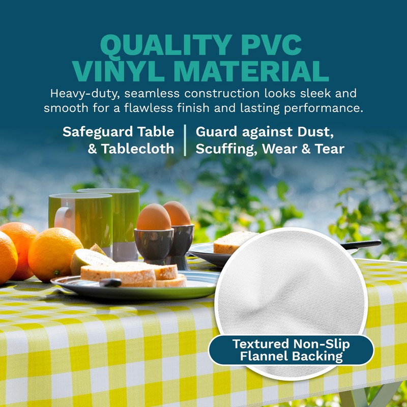 - HEAVY DUTY, WATERPROOF VINYL CONSTRUCTION- The tablecloth and bench cloths are made with heavy duty vinyl PVC that is waterproof, stain resistant, spill-proof and easy to clean. Under the vinyl, our cloths are reinforced with soft flannel backing so that they do not slip off or skid while using.