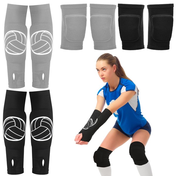 Sosation 2 Set Volleyball Knee Pads and Volleyball Arm Sleeves with Protection Pad Compression Forearm Wrist Guard with Thumb Hole Soft Breathable Pads for Hitting Passing(Black, Gray)