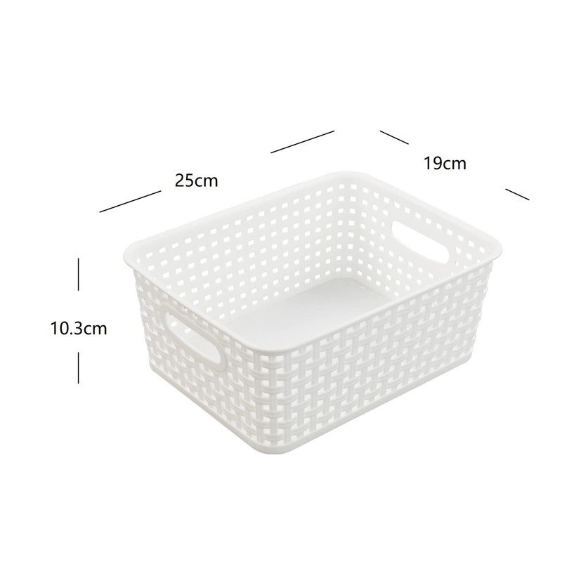 Introducing the Sosody White Plastic Woven Storage Baskets, a 6-pack of durable, lightweight, and easy-to-clean containers. Each basket measures 25 x 19 x 10.3 cm, making them perfect for organizing various spaces such as cupboards, cabinets, shelves, refrigerators, drawers, pantries, and desktops. The woven design not only adds a touch of style but also provides moisture resistance and ventilation for quick drying. Use these practical baskets to store snacks, medicines, toiletries, office supplies, cosmetics, and sundries. Made of strong plastic, they are sturdy and built to last, yet light enough to move around with ease. The cut-out handles make transportation simple, while the white finish complements any decor. Upgrade your storage game with these versatile Sosody baskets.