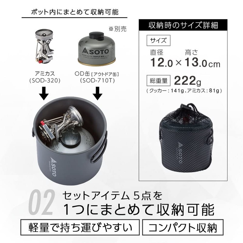 - Set details: SOD-320 (Amicus, Storage Case) + SOD-511 (Aluminum Pot 33.8 fl oz (1,000 ml), Pot Lid, Mesh Storage Bag)