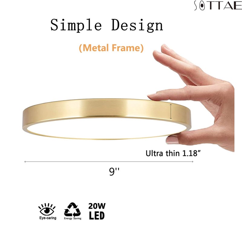 - Standard Size:9" Diameter,1.18" Ultra-thin,The flat-mounted ceiling lamps have a smooth surface and no bulge,Simple-designed,elegant brushed gold finish metal base,suitable for a variety of decorative styles