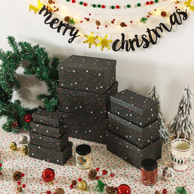 Soul & Lane Christmas Boxes with Lids - Set of 10, Charming Festive Gift Boxes, Decorative Cardboard Holiday Storage with Enchanting Leafy Botanical Pattern