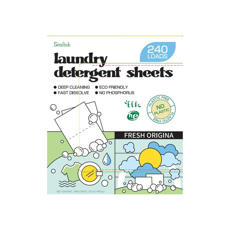 • Our Mission - Making life easy!Our pursuit is to make cleaning convenient and life simple. All packaging and ingredients of Soulink laundry detergent sheets are eco-friendly. When you buy soulink products, you are also contributing to the reduction of ecological pollution and the protection of the earth. Now, join us!