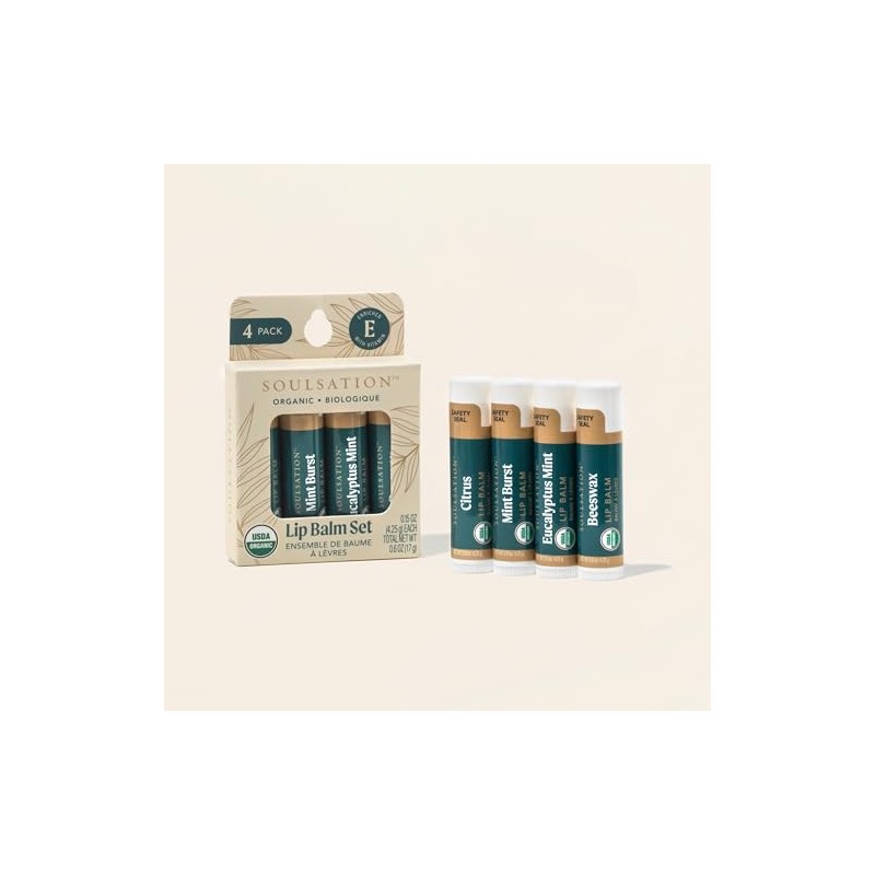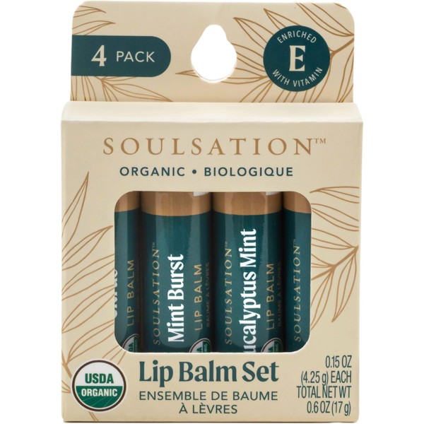 Soulsation Organic Lip Balm Set, 4 Flavors - Moisturizing for Cracked & Dry Lips