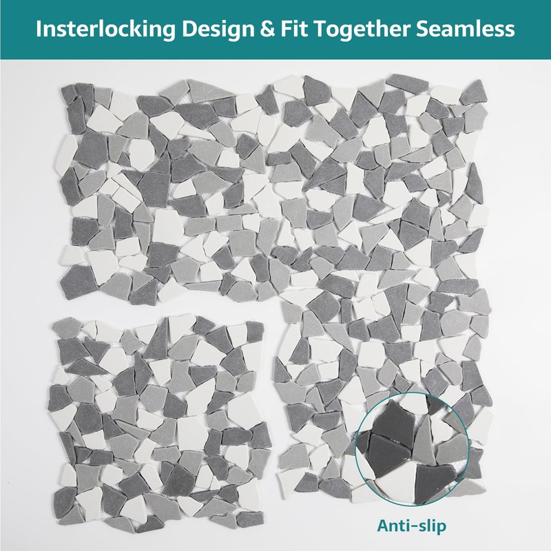 - [Mesh Backing] -The pebble tile uses safe glue attached to a sturdy mesh backing, easy to cut, interlocking design for easy seamless installation, setting up the layout before installation will be better.