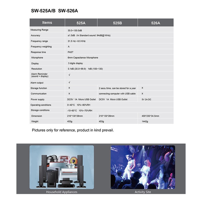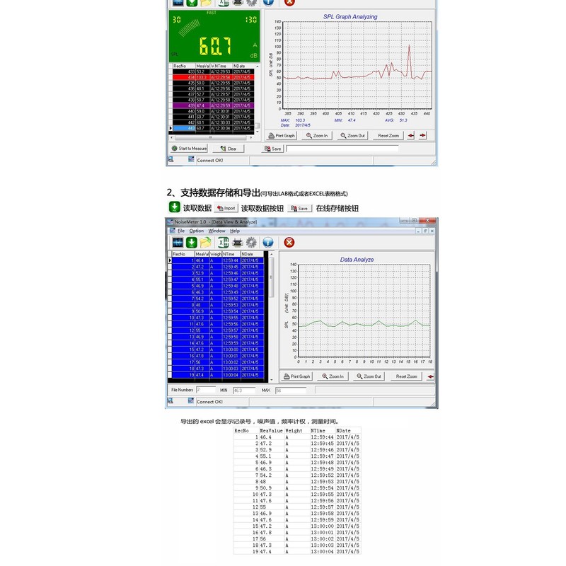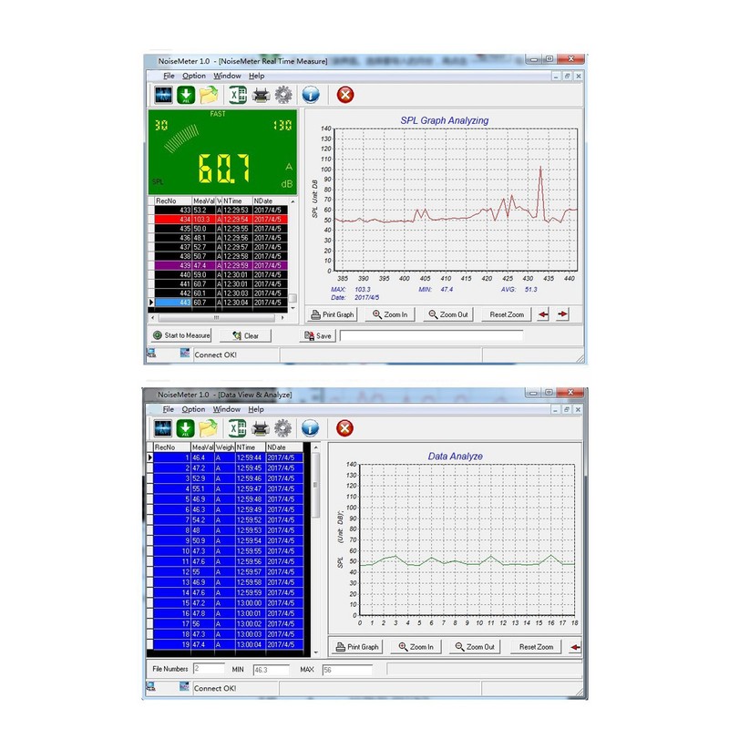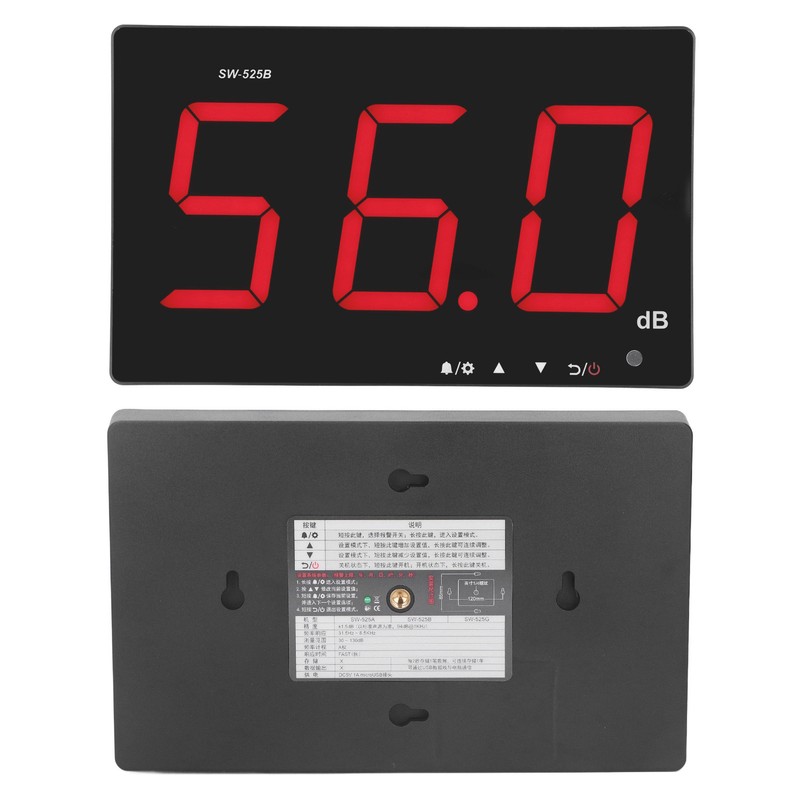 1、Parameters: The sound level meter has a measurement range of 30 to 130dB, an accuracy of ±1.5dB (reference sound pressure level, 94dB 1KHz), and a frequency response range of 31.5Hz‑8.5KHz. 2、HD Screen, Backlit: The sound level meter features a large 9.6‑inch LCD display with HD backlight, so you can easily read all day at your convenience. 3、Plug and Play: Noise decibel reader is simple to set up, just plug in the power supply and use, DC 5V 1A Micro USB power supply, convenient and fast, plug and play. 4、Data Saving: Noise decibel reader has data export and memory storage functions, after starting, save data every two seconds, data retention for 1 year. 5、Line Chart: The sound meter can be connected to a computer to observe the noise change through the line chart, which is more intuitive. Usually in a very quiet room, this value will not fall below 40dB, which is normal. 6、Alarm Indicator: Sound meter alarm when the indicator flashes, accompanied by beep alarm sound, alarm time adjustable: 6s‑120s, alarm sound adjustable: 1‑3 levels. 7、Widely Used: The back of the sound meter has mounting holes, easy to install, widely used in homes, offices, clubs, college classrooms, hotel rooms, hospital wards, hotels, laboratories and other places.