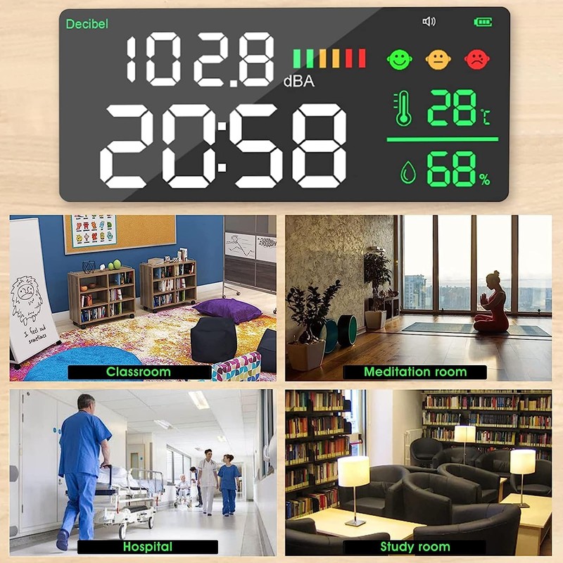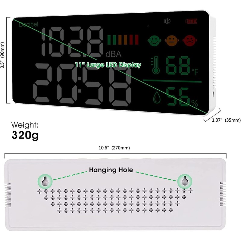 - Wide applications: the ultra-large 11 inch LED display makes it easy to read, even from a distance. The practical sound level indicator helps you capture the current sound level, humidity, time and temperature at a glance. Widely used in classrooms, hospitals, gyms, studio rooms, offices, living rooms and bedrooms, etc.