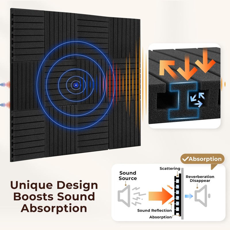 - [Unique Design Boosts Sound Absorption] Unlike other sponge acoustic wall panels, this one features a T-shaped design to enhance sound absorption. Its unique shape creates additional absorption surfaces and gaps, allowing sound waves to enter from multiple angles and increasing the likelihood of absorption. The concave and convex shape can cause sound waves to be reflected, absorbed and consumed after entering the gap, thereby reducing the noise.