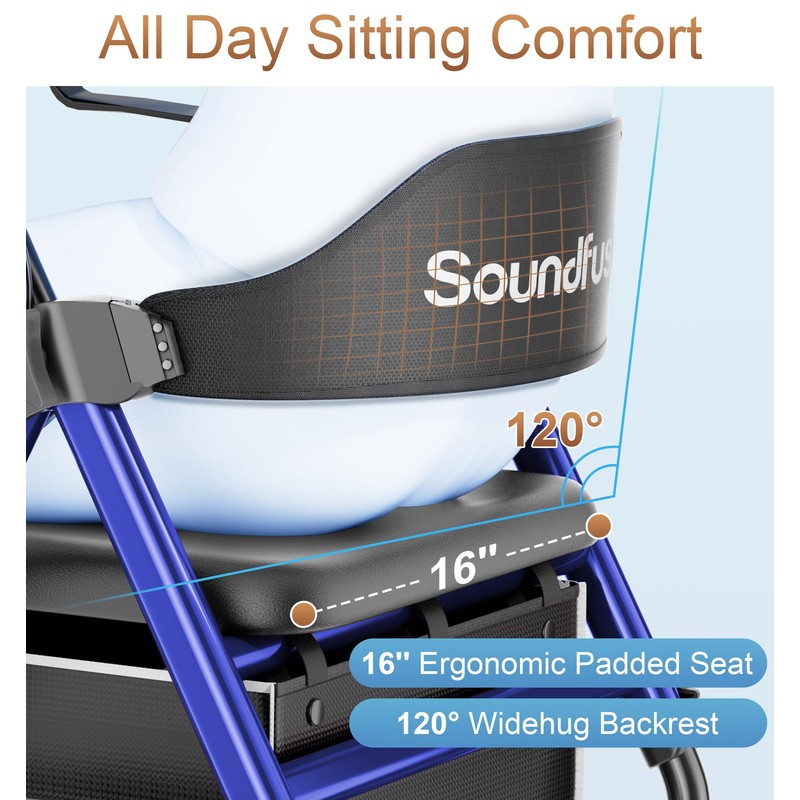 - Stable & Foldable - Soundfuse walkers for seniors is crafted with a reinforced aluminum alloy frame and double support bars, supporting up to 350 lbs. Weighs 17.6 lb, this rolling walker with seat features a quick-fold design, making it easy to transport and store in the car trunk