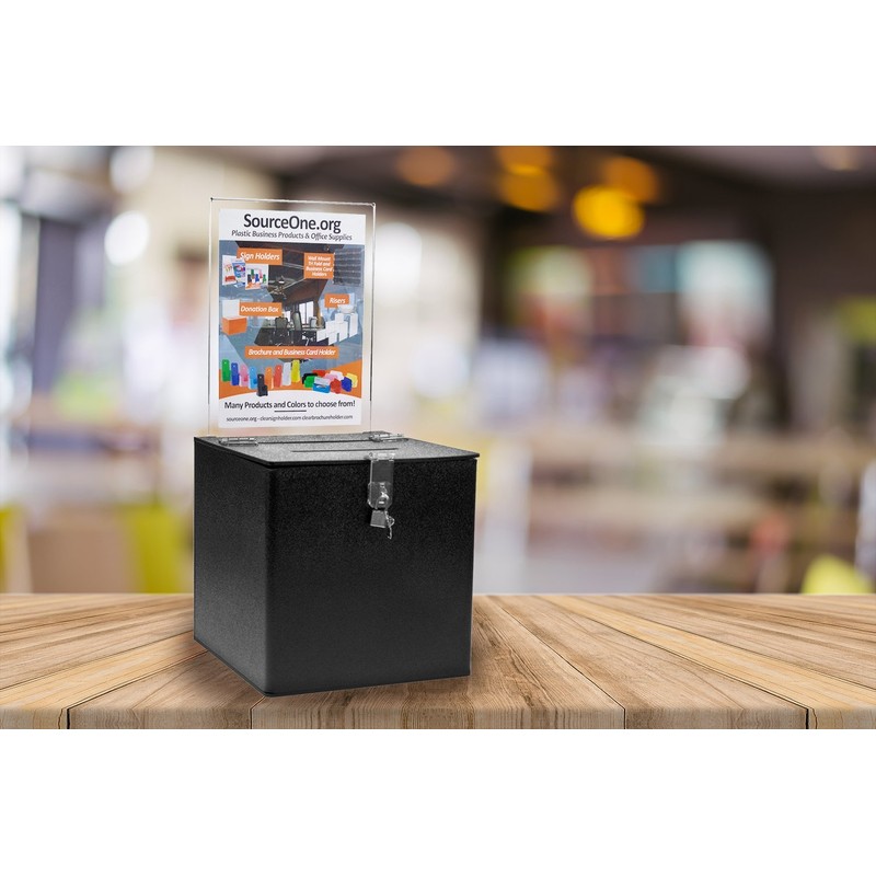 - DIVERSE PRODUCT TYPE. This package contains 1 black donation box. It is available by SourceOne in multiple other colors. This means its perfect for all organizations, charities, posters, announcements, and fundraising needs. The acrylic sign holder has an opening at the side for easy paper insertion.