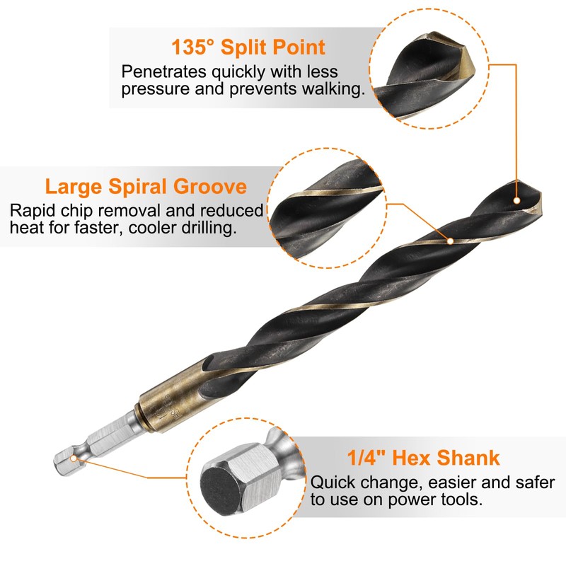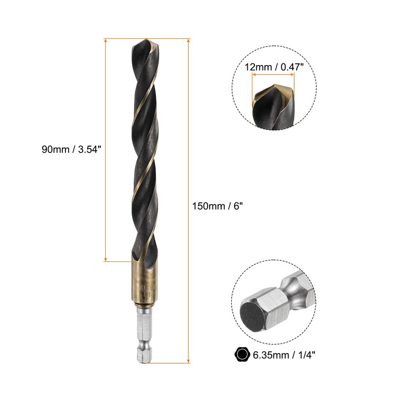 - Size - Drill diameter: 12mm / 0.47", cutting edge length: 90mm / 3.54", total length: 150mm / 6", hex shank diameter: 6.35mm / 1/4", split point: 135 degree; The 135° pointed head design is more labor-saving and has good radial stability to prevent movement and make drilling precise without center punching.