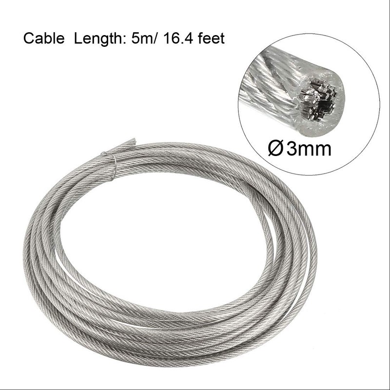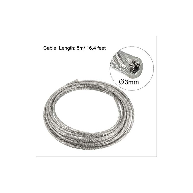 - Size - Cable Diameter: 3mm / 1/8", Type: 7x7 Strand, Total Length: 5m / 16.4ft. This stainless steel wire rope has a flexible structure and can be easily cut into many different sizes to meet your needs.
