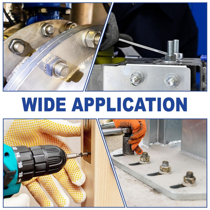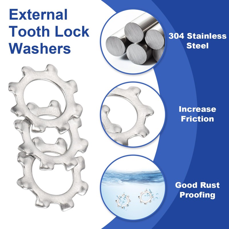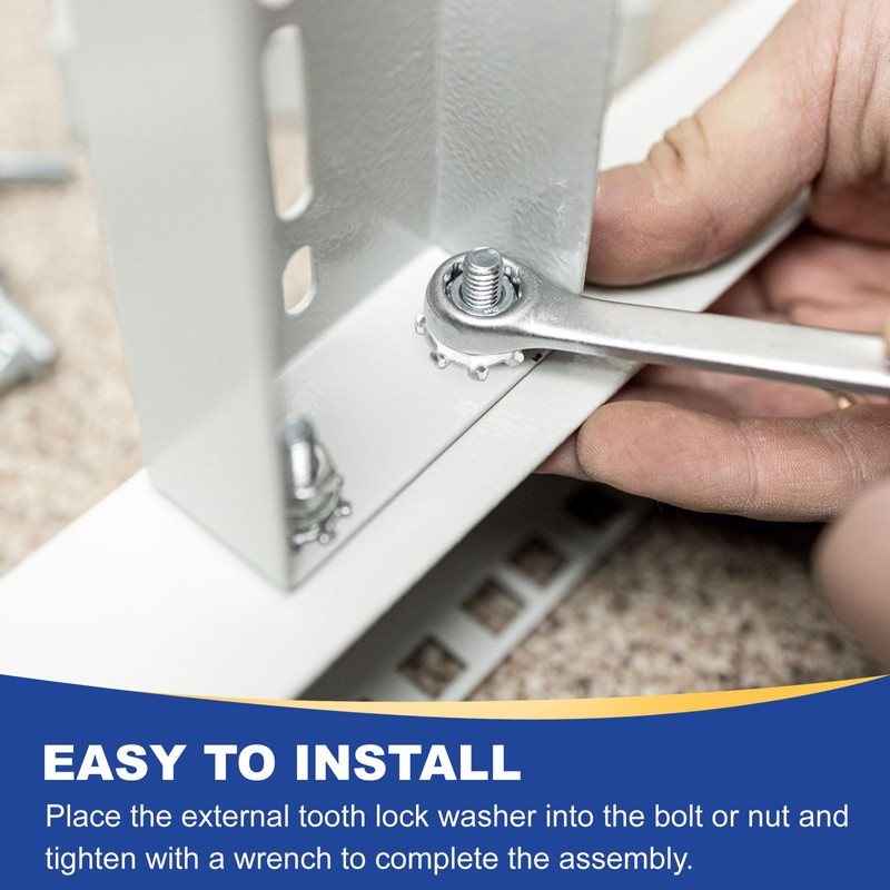 - [Easy to Install] - Simply select the corresponding external tooth lock washer according to the size of the bolt or nut, place the external tooth lock washer in the bolt or nut, make the external teeth engage with the contact surface, and then use a wrench to tighten the nut or bolt to complete the assembly