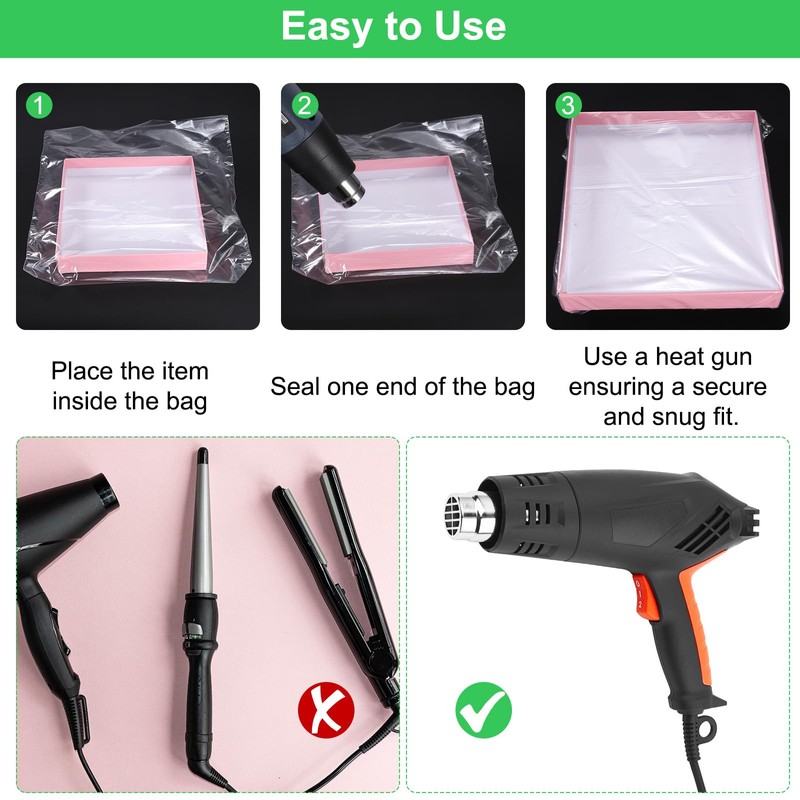 Easy to Use: Place the item inside the bag, then seal one end of the bag. Use a heat gun to shrink and seal the bags, ensuring a secure and snug fit. The hair dryer temperature is insufficient for this POF shrink bag to shrink or seal.