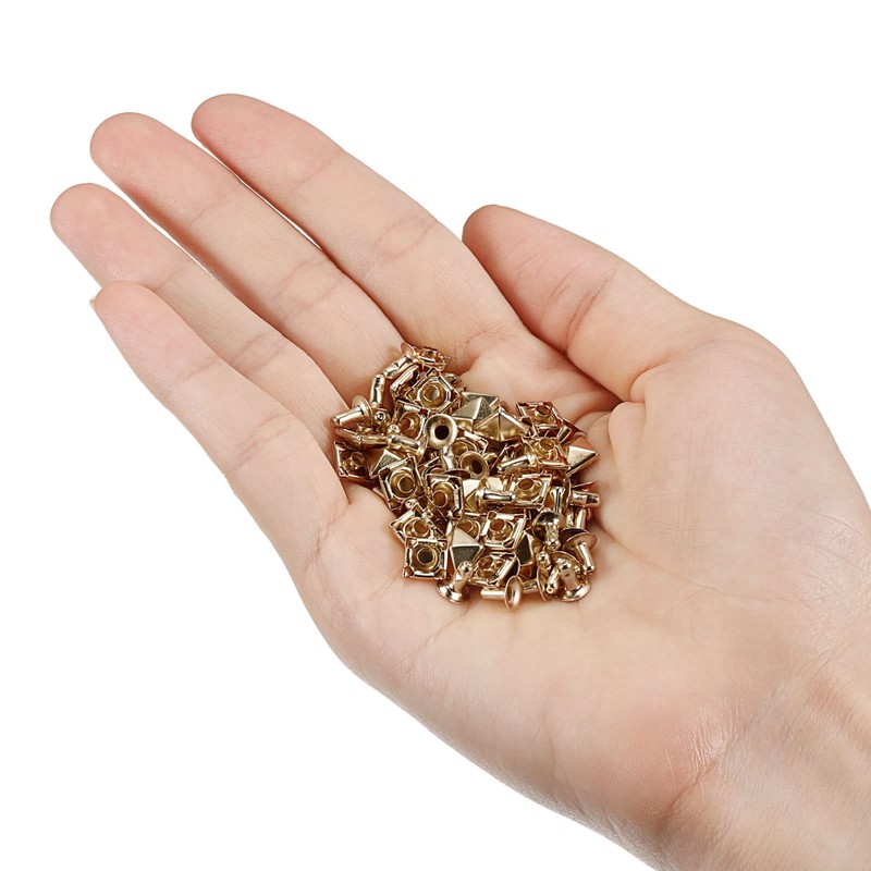 - Color: Light Gold; Rivet Cap Size: 7mm x 7mm / 0.28" x 0.28"(L*W); Base Height: 6mm / 0.24"; Suitable for (Max.): 2.5mm / 0.1" Thick; Package Included: 100 Sets x Pyramid Rapid Rivet Studs(100pcs Caps, 100pcs Posts)