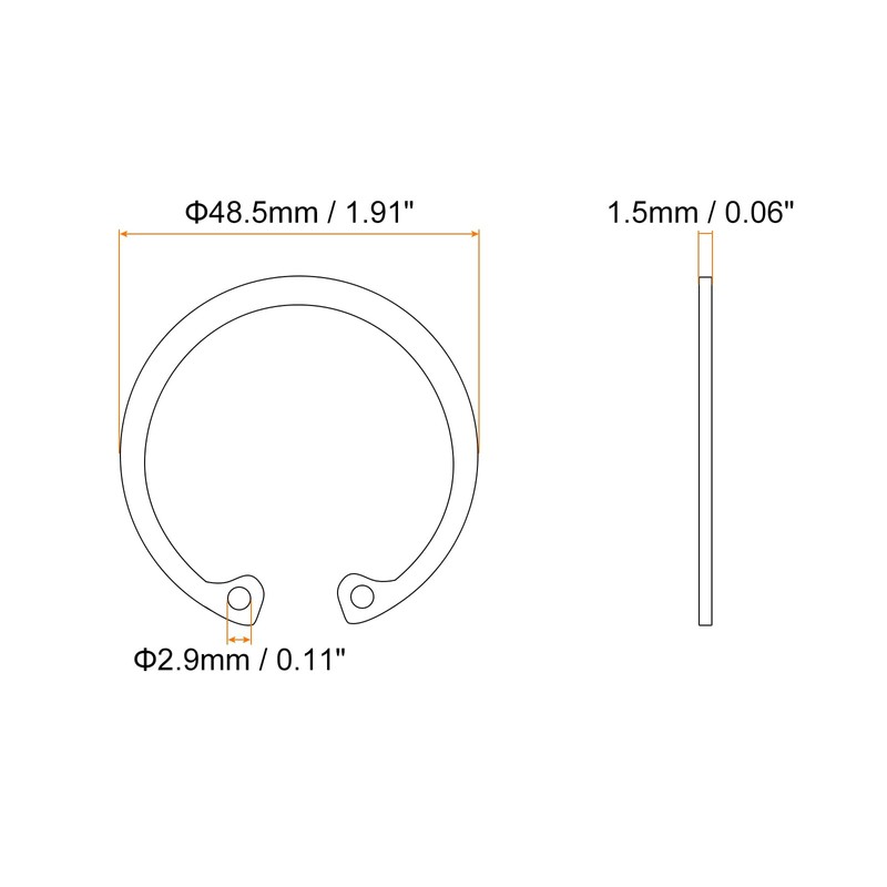 - [SIZE & PACKAGE]: Package contains 10 pcs of internal retaining ring circlip, the outer diameter of 48.5mm/1.91", the thickness of 1.5mm/0.06", the hole diameter of 2.9mm/0.11", and opening width of 4.3mm/0.17".