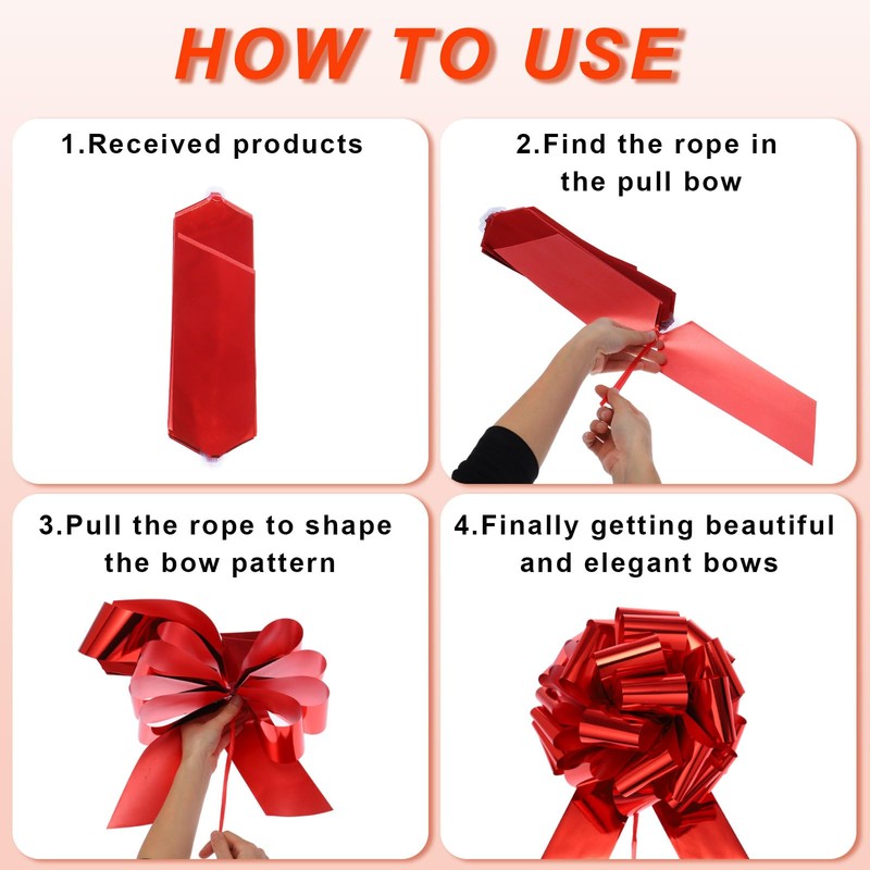 - Bright colored organza pull bows with ribbons are suitable for wedding car decoration bows, gift wrapping bows, large present decorating bows, DIY crafts handicraft decoration, gift wrapping packaging, holiday decoration, wedding gift baskets decoration, flower design, party decoration, floral bouquet ribbon, scrapbooking, and can be used to decorate Valentine's Day, Christmas, Halloween, Thanksgiving, Teacher's Day, etc.