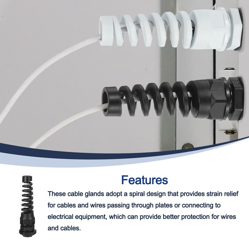 Design - These cable glands adopt a spiral design that provides strain for cables and wires passing through plates or connecting to electrical equipment, which can provide better protection for wires and cables.