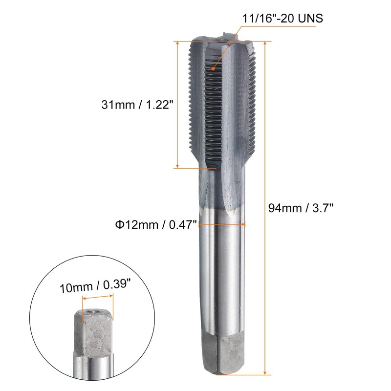 • Size - Thread Size: 11/16"-20 UNS; Shank Diameter: 12mm / 0.47"; Flute Length: 31mm / 1.22"; Total Length: 94mm / 3.7"; Square Head: 10mm / 0.39"; Flute Style: 4 Straight Flutes; Cutting Direction: Right Hand; Style: Flat Head Plug Tap.