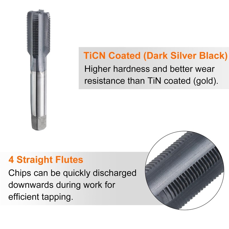 • Material - By adding 5-8% cobalt to a general 6542 high-speed steel thread plug tap, hand taps with cobalt can have higher hardness(67-68HRC) and precision, better wear resistance and toughness, and higher heat resistance. The surface is coated with TiCN (Dark Silver Black), which has higher hardness and better wear resistance than TiN coating (Gold).