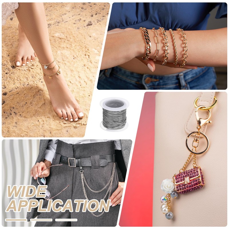 Wide Application: It is widely used in various DIY jewelry production, such as necklaces, bracelets, anklets, earrings, waist chains, headwear, etc. It can also be used in various handicrafts, including DIY key chains, sunglasses chains, clothing chains, craft chains, bag decorations, etc.