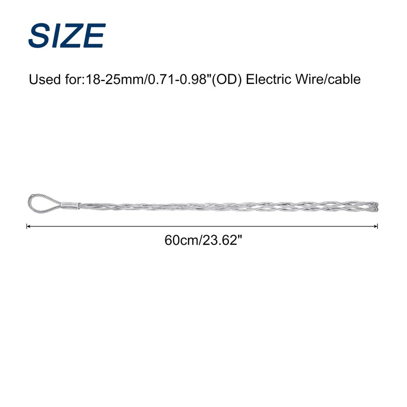 - The wire puller socks ,is in size of:Length:37cm/14.57 inch; Used for:18-25mm/0.71-0.98 inch Electric Wire/cable; Color:Original, Shape: Single Head Side Pull Mesh Sleeves; Material: Galvanized Steel; In the package of: 1 x Cable Pulling Socks Grip