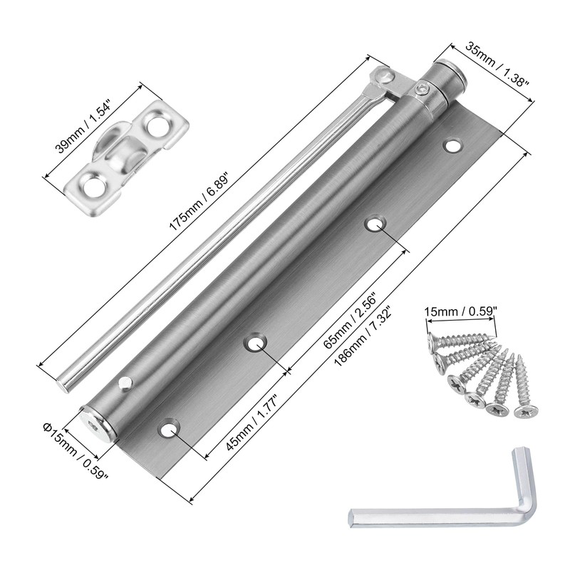 - [Spring Door Closer] - Our auto spring door closer can be installed in the door 5kg, the door closer Length is 195 mm/7.68 inches, with the arm rod length: 175 mm / 6.89 inches; The arm is adjustable, so you only need to lower it when you don't need to use it, without completely disassembling it.